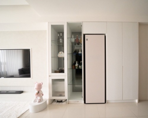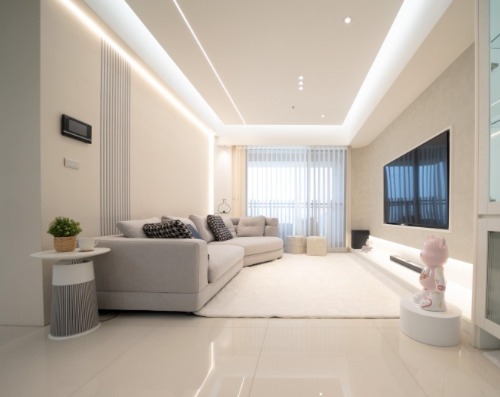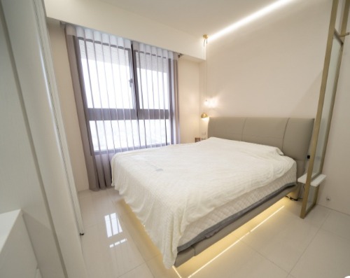 於是好睡王的設計師團隊選擇採用大量白色的牆面、櫃體為主體,為了不讓空間過於清冷,於是利用間接照明打造出帶點暖調的空間氛圍;再以線條勾勒與材質細節做出視覺層次,搭配類似色系的家具點綴空間,使得視覺豐富不單調卻又清爽透亮!