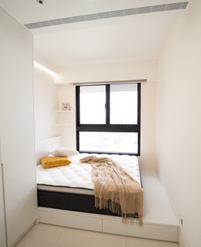 小坪數最大的痛點便是收納空間不足,但只要多加把握垂直收納的原則,像是頂天立地櫃、床架的底部收納,都可以在不影響生活動線下增加收納空間。另個收納空間的小秘訣就是善用隱藏式的櫃體,一方面能營造空間視覺的延伸,不會有截斷雜亂的感覺;另一方面是透過櫃門就能遮住內部雜亂的物品,有效減少因空間限制而產生的凌亂感。