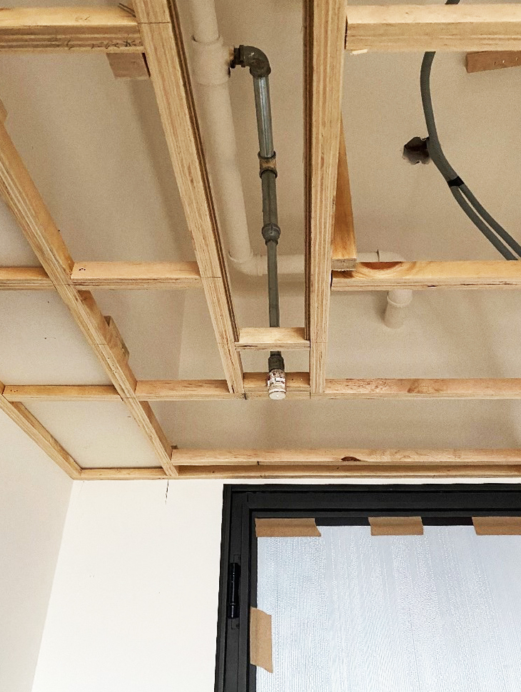 天花板、冷氣包管、木作窗簾盒、電視牆木作底