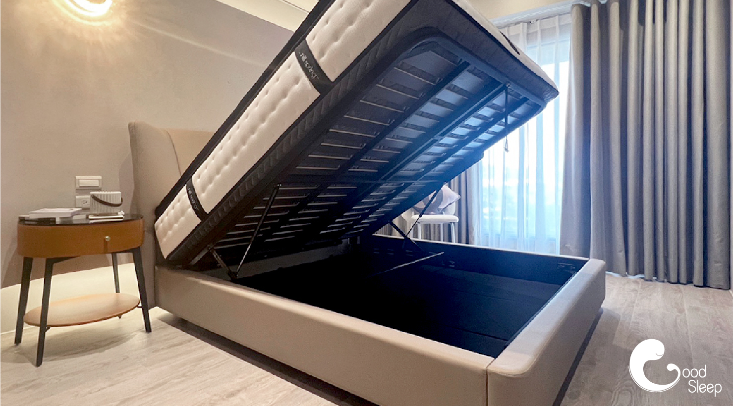 La la臥房選擇奶茶色系「Manet馬奈掀床式床架」增加儲物空間更好收納,靈活運用空間。