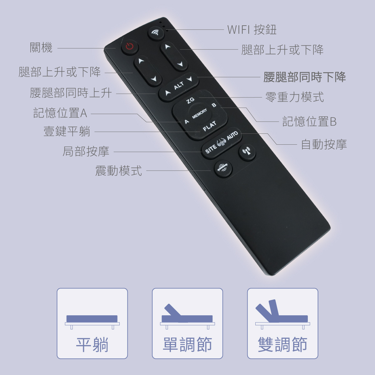 1.3D零重力軟硬智眠床墊與天際五段式電動床皆為床墊式電動床設計
