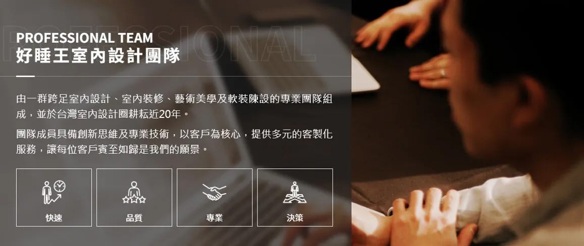 我們不僅擁有專業的室內設計團隊為客戶的空間設計與施工,更搭配好睡王家居專業軟裝規劃師為客戶進行家具量身打造的規劃服務與建議,完整的構築客戶的需求,在每一個作品皆能品嚐獨一無二的細膩巧思,秉持著對專業的要求,一起為客戶共譜家未來的樣貌。