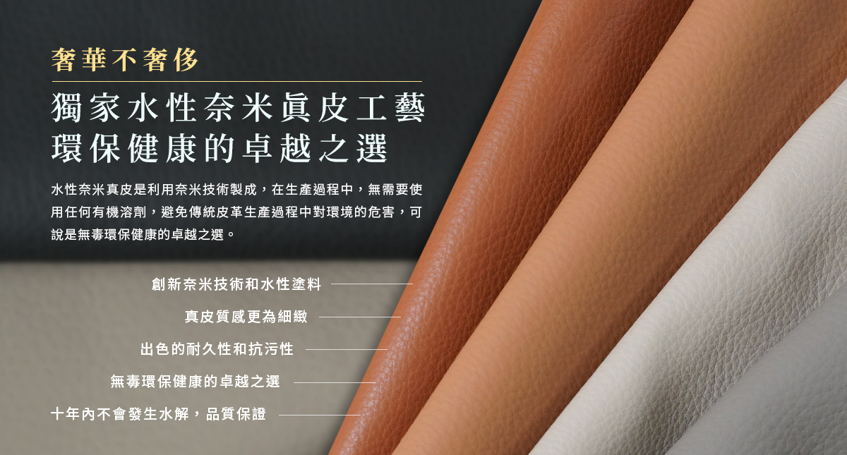 水性奈米真皮擁有真皮的觸感,細膩整齊的紋路,耐磨、耐刮、極強的防水材質,不含甲醛等有害成分,確保居家健康安全。透過創新技術,水性奈米真皮不僅延長皮革的使用壽命,更能滿足喜愛真皮觸感的消費者需求。尤其適合家中有養寵物的朋友或是有學齡前的孩童,這種材質的家具商品在耐用性、觸感舒適度以及環保特性方面都表現卓越。水性真皮/牛皮無疑是未來家具市場中的新時尚,提供一個健康、環保且高品質的選擇。