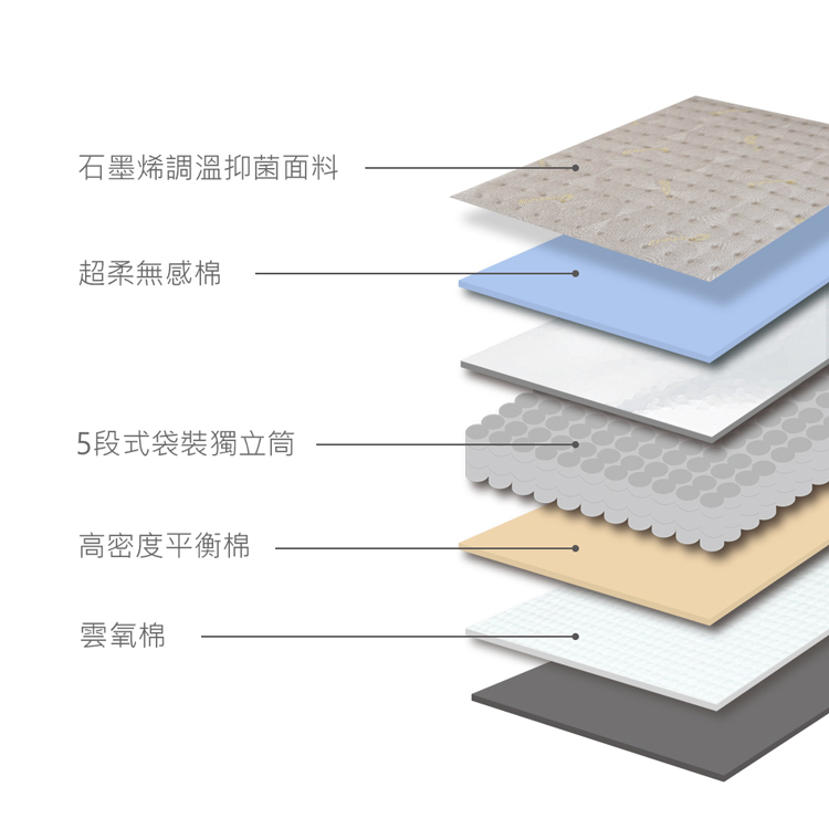 ✢五段式獨立筒設計,分區支撐、貼合包覆身型
