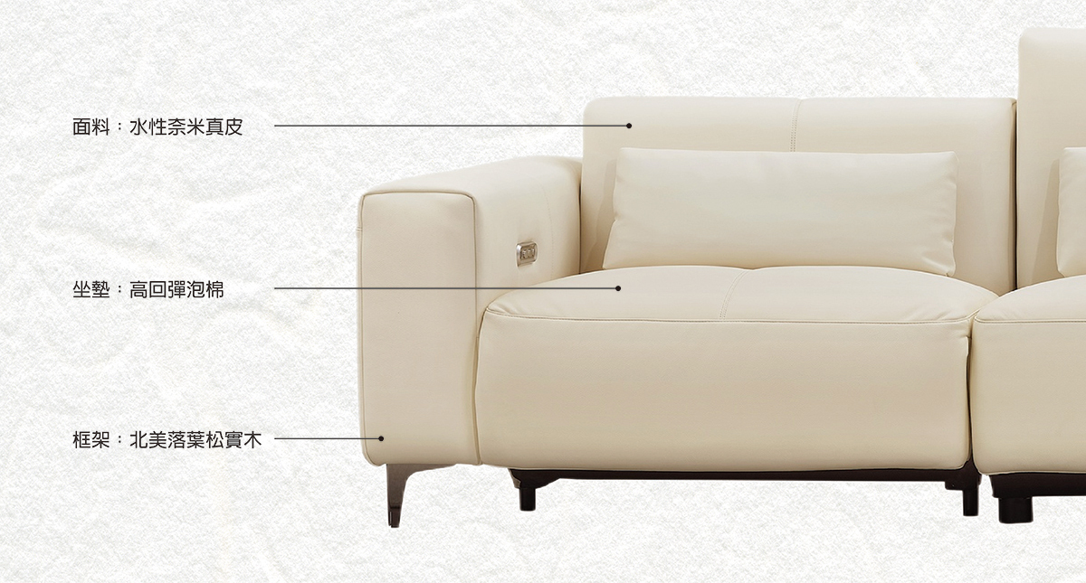 水性奈米真皮擁有真皮的觸感,細膩整齊的紋路,耐磨、耐刮、極強的防水材質,不含甲醛等有害成分,確保居家健康安全。透過創新技術,水性奈米真皮不僅延長皮革的使用壽命,更能滿足喜愛真皮觸感的消費者需求。尤其適合家中有養寵物的朋友或是有學齡前的孩童,這種材質的家具商品在耐用性、觸感舒適度以及環保特性方面都表現卓越。水性真皮/牛皮無疑是未來家具市場中的新時尚,提供一個健康、環保且高品質的選擇。