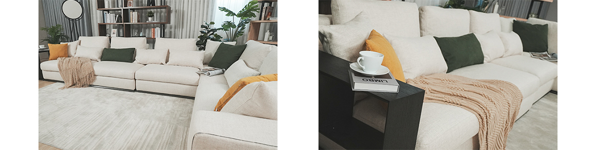 扶手部分具備開放式儲物空間,方便存放遙控器、書本或小物件,讓日常生活更加便利整潔。賦予了扶手獨特的造型感,增添整體沙發的現代美學