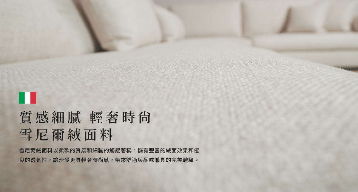 雪尼爾絨具備優良的透氣性,使長時間坐臥依然保持清爽舒適,同時耐磨性佳,經久耐用