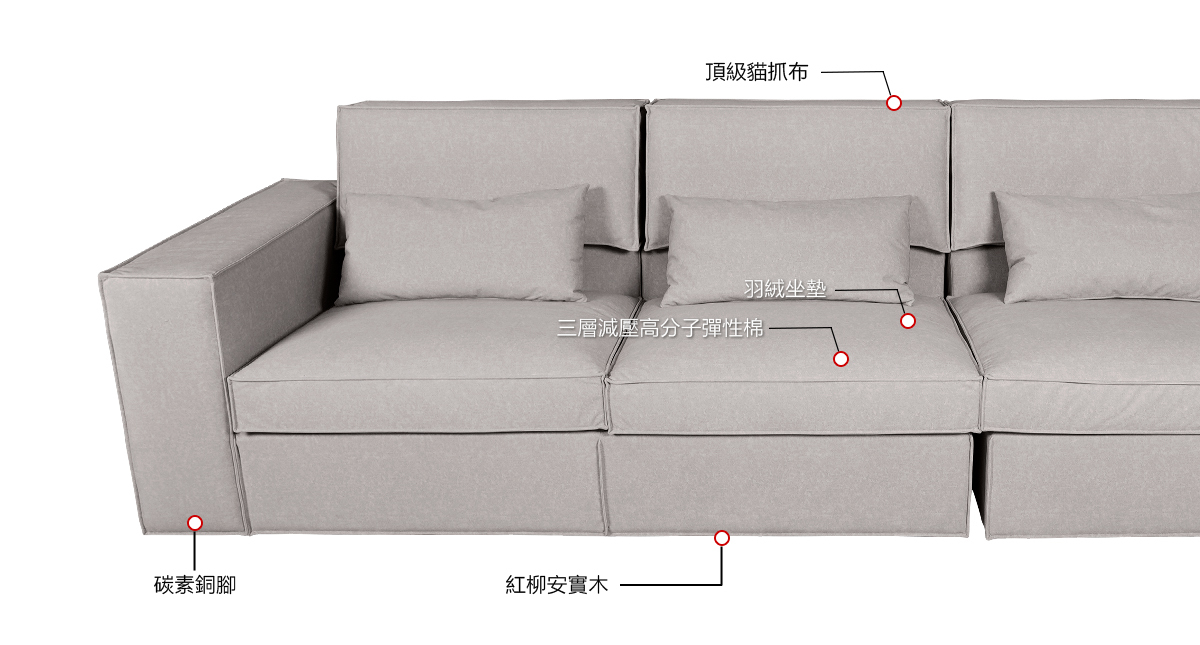 可隨心所欲的調整靠墊與抱枕,整座沙發布套可拆洗設計,清潔超Easy!