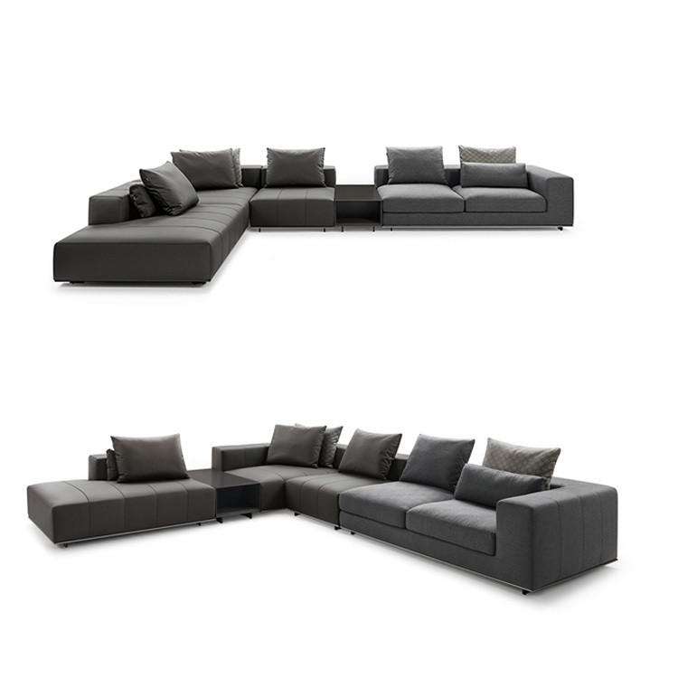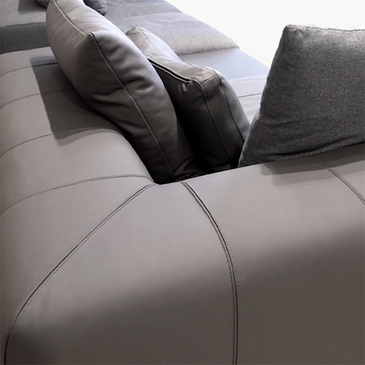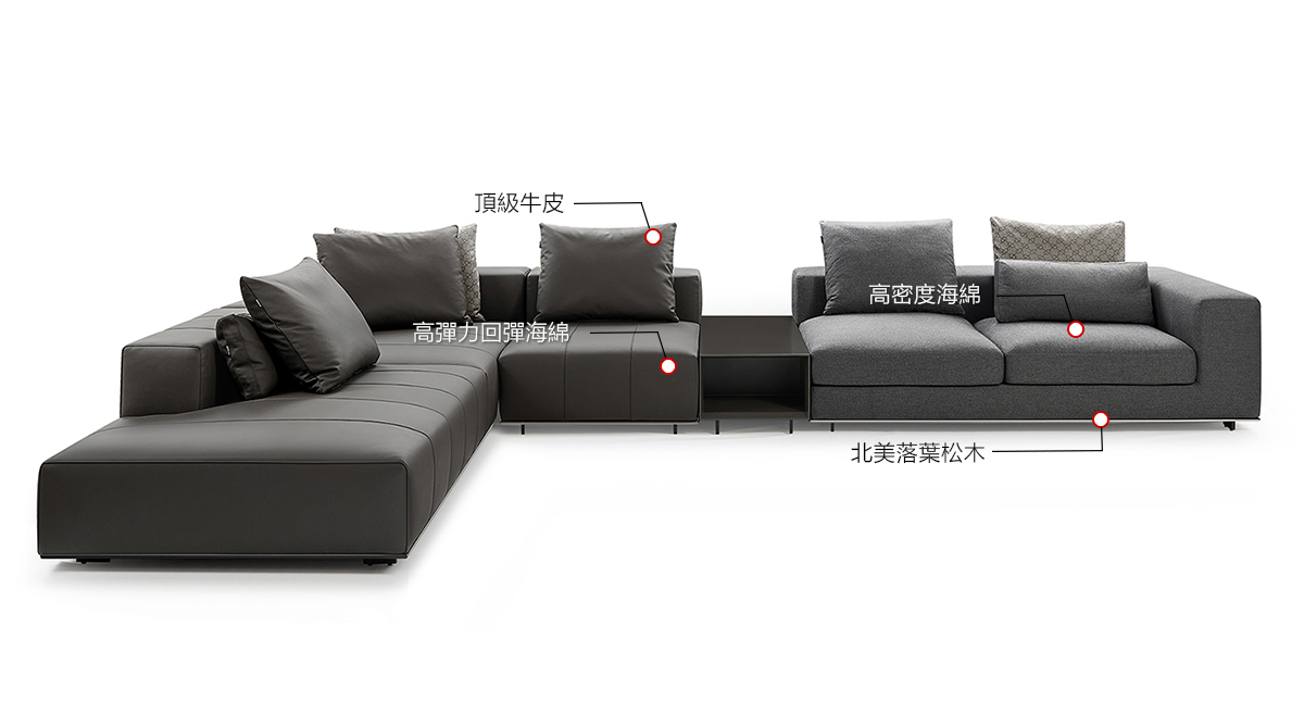 Milo Sofa沙擁有兩種不同的調性,俐落的線條比例,使用全牛皮與布藝面料異材組合