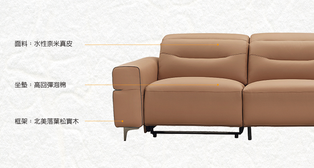 水性奈米真皮擁有真皮的觸感,細膩整齊的紋路,耐磨、耐刮、極強的防水材質,不含甲醛等有害成分,確保居家健康安全。透過創新技術,水性奈米真皮不僅延長皮革的使用壽命,更能滿足喜愛真皮觸感的消費者需求。尤其適合家中有養寵物的朋友或是有學齡前的孩童,這種材質的家具商品在耐用性、觸感舒適度以及環保特性方面都表現卓越。水性真皮/牛皮無疑是未來家具市場中的新時尚,提供一個健康、環保且高品質的選擇。