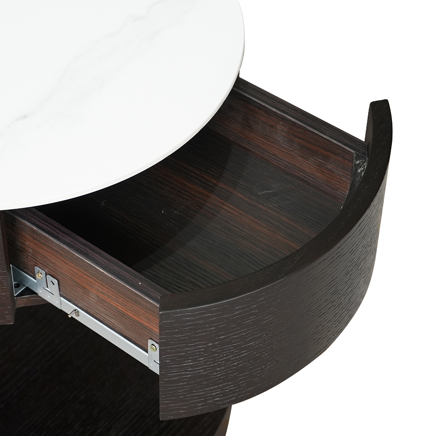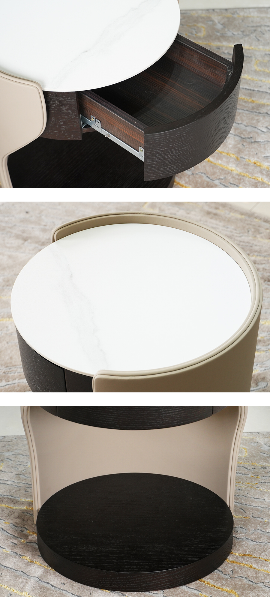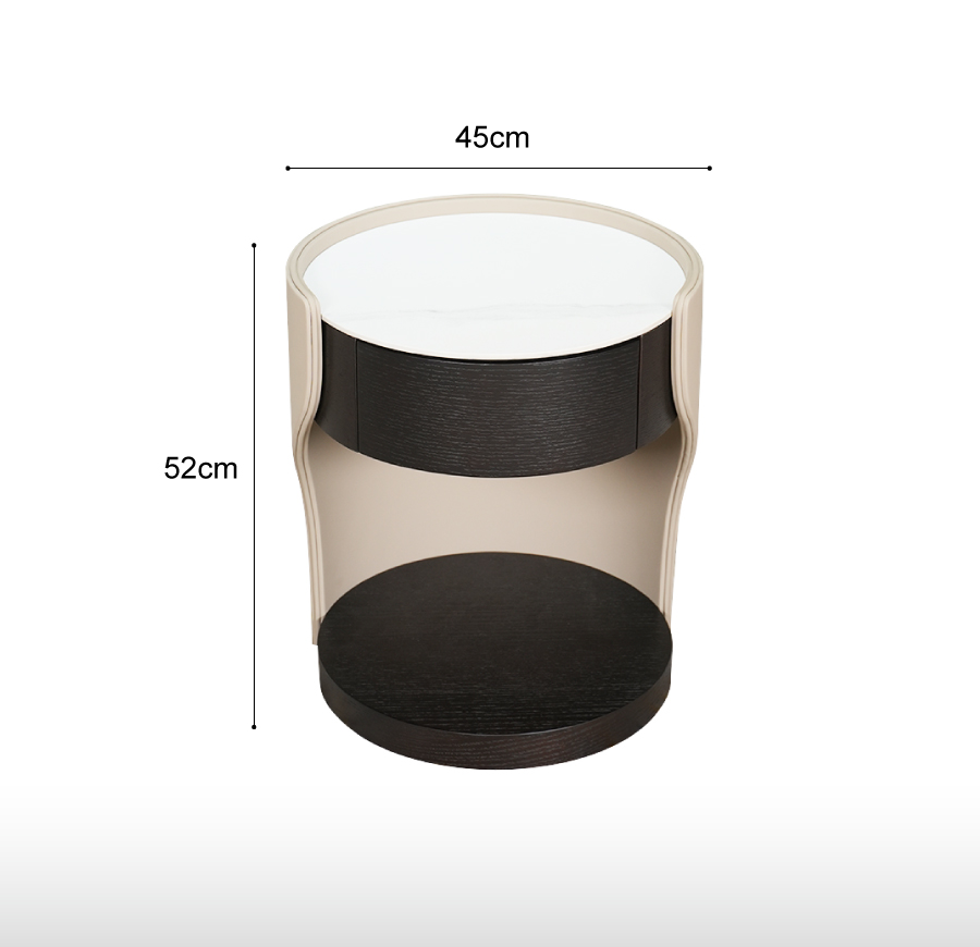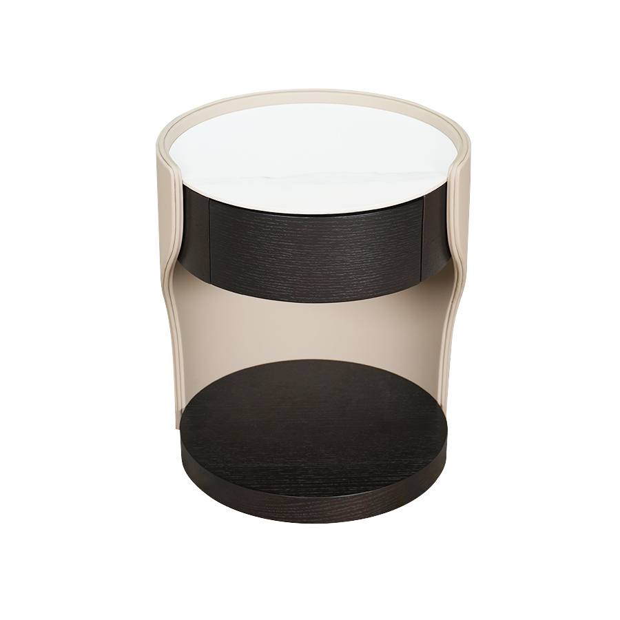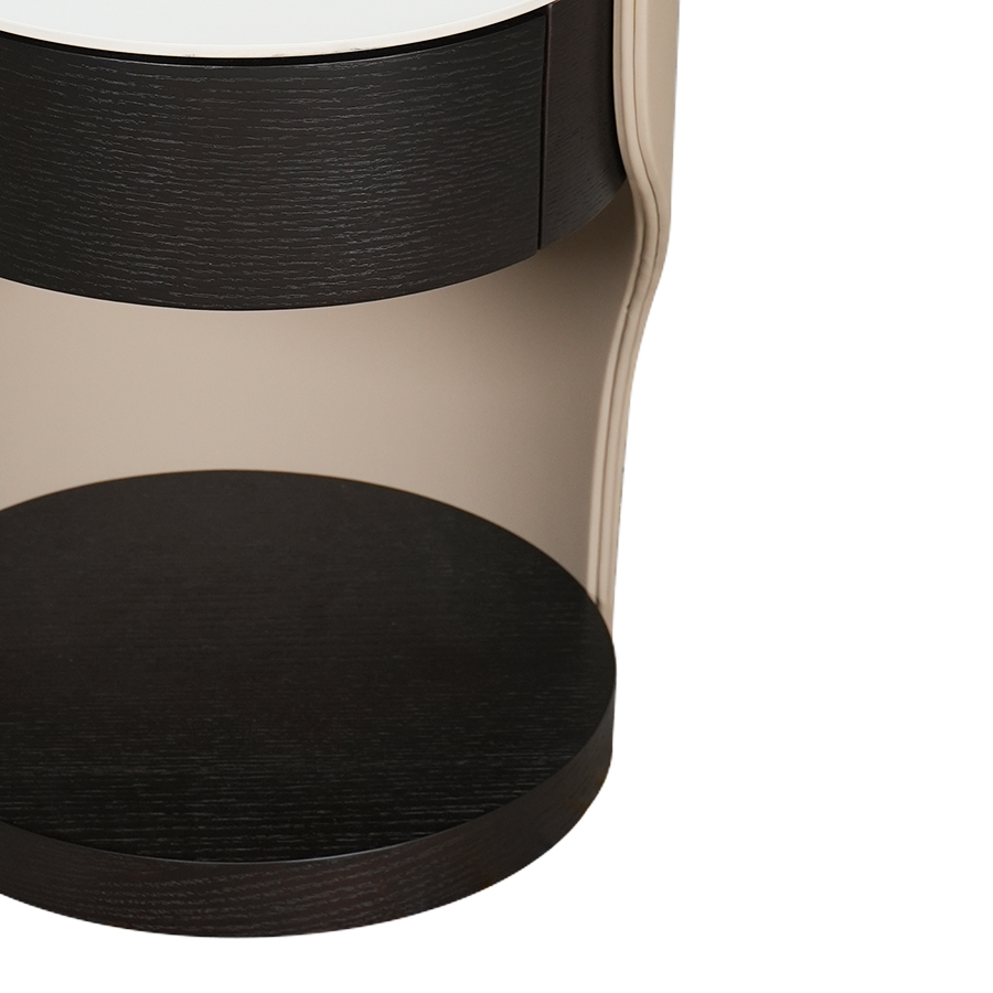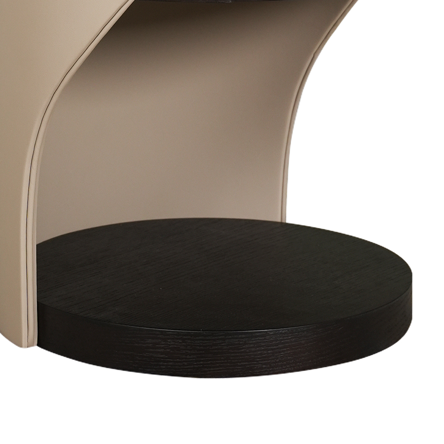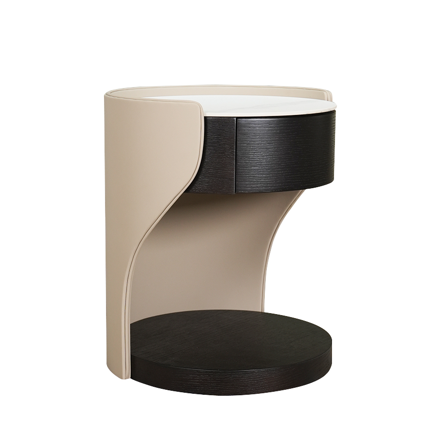 Babu床頭櫃帶有輕奢風格以優雅曲線和精緻皮革包覆為特色,一抽設計實用且質感頂級。